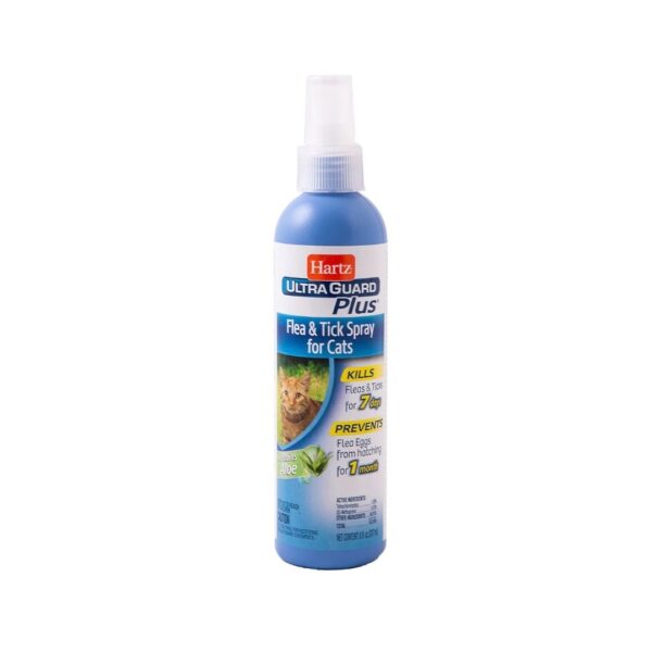 Hartz® UltraGuard Plus™ Spray for Cats is a water-based spray kills fleas and ticks from hatching for 7 days PLUS prevents flea eggs for up to 30 days. In addition, this spray contains aloe to help calm and soothe itchy, irritated skin caused by fleas & ticks. For use on kittens 12 weeks of age or older.