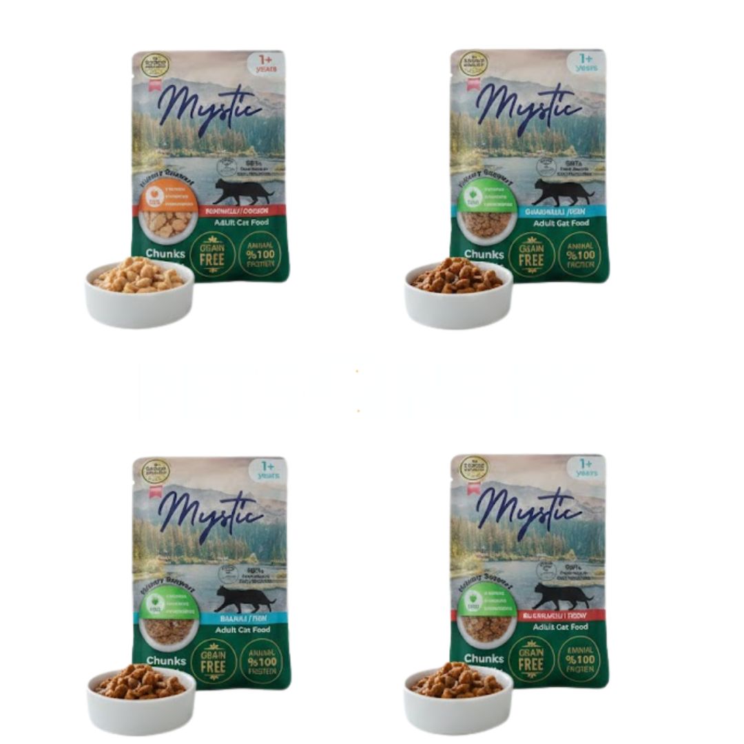 Mystic 1+ Chunks In Jelly. Specially formulated for cats aged 1 year and above, this tasty wet food features tender meat chunks in soft jelly that support hydration, digestion, and everyday vitality.